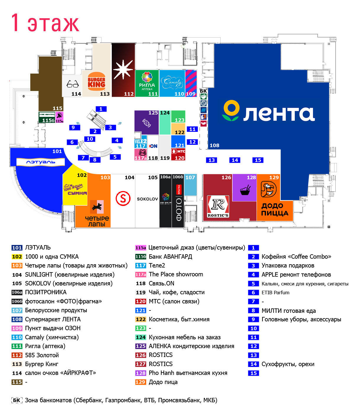 Якорным арендатором торгового центра является Супермаркет "Лента", предлагающий своим покупателям тщательно отобранный ассортимент продуктов питания, изысканную готовую продукцию и полуфабрикаты. Для постоянных покупателей, а также для гостей, торговая сеть "Лента" предлагает различные дисконтные программы, а также различные акции в течение всего года.