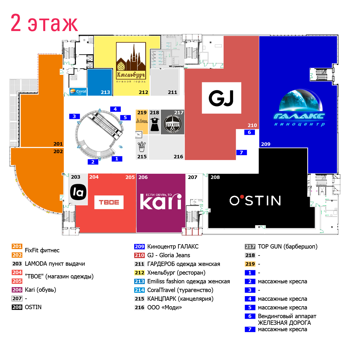 В торговой галереи расположены магазины «Gloria Jeans», «KARI», «OSTIN», «ТВОЕ», «МОДИ», «ЛЭТУАЛЬ», «SUNLIGHT», «4 Лапы», «КанцПарк», «Айкрафт», «585 Золотой», «SOKOLOV», «ПОЗИТРОНИКА», Эко Фитнес «FixFit» и пр.